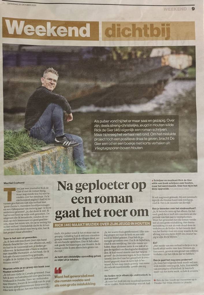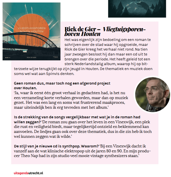 Kan iets hélemaal mislukken? Het is een filosofische vraag die past bij het nieuwste project van popmuzikant, schrijver en filmjournalist Rick de Gier (46) uit Utrecht. Voorheen actief bij indieband Ponoka, nu solo én Nederlandstalig. 12 september verschijnt onder eigen naam het eerste album – Vliegtuigsporen boven Houten – vergezeld door een verhalenbundel. Geïnspireerd door Depeche Mode, Sparklehorse en Spinvis, maar bovenal door de plek waar hij opgroeide: Houten.